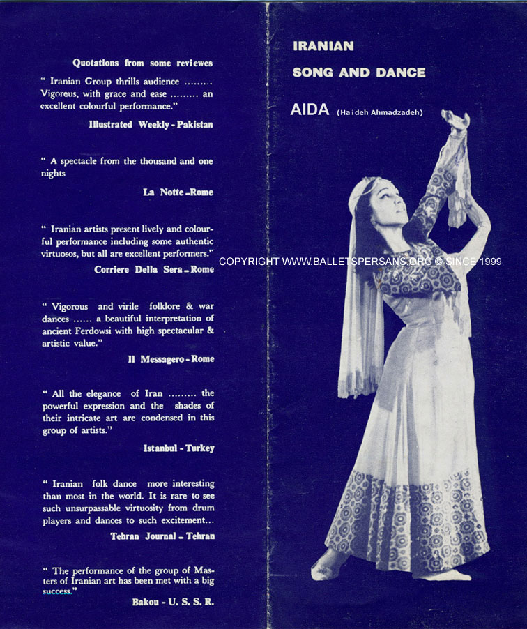 As its first international introduction, the "National Folkloric Music, Song and Dance Ensemble" participated in the International Folk Dance Festival in Turkey, in 1959. Later in 1964 the troupe made an extensive tour in Pakistan, Afghanistan, Tunisia, Morocco, the USSR and almost all East European countries. The ensemble gave also a week of performances at the Iranian pavilion in Canada at Expo 1967 and Expo 1970 in Japan. Another considerable tour in the USSR, Afghanistan and Tunisia was organized during 1968-69.