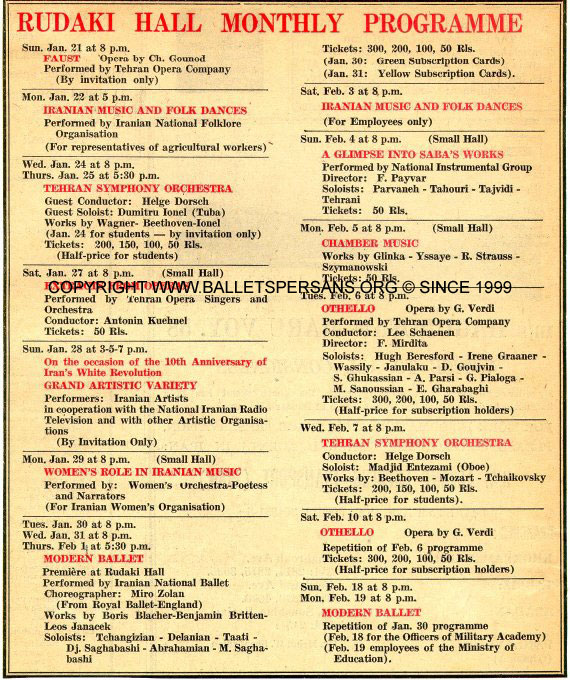 During this period, the international mega stars of ballet and contemporary dance including Maurice Béjart, Alvin Ailey, Martha Graham and Birgit Cullberg visited Iran to stage works in the Roudaki Hall Opera or to create choreographies for the national company.