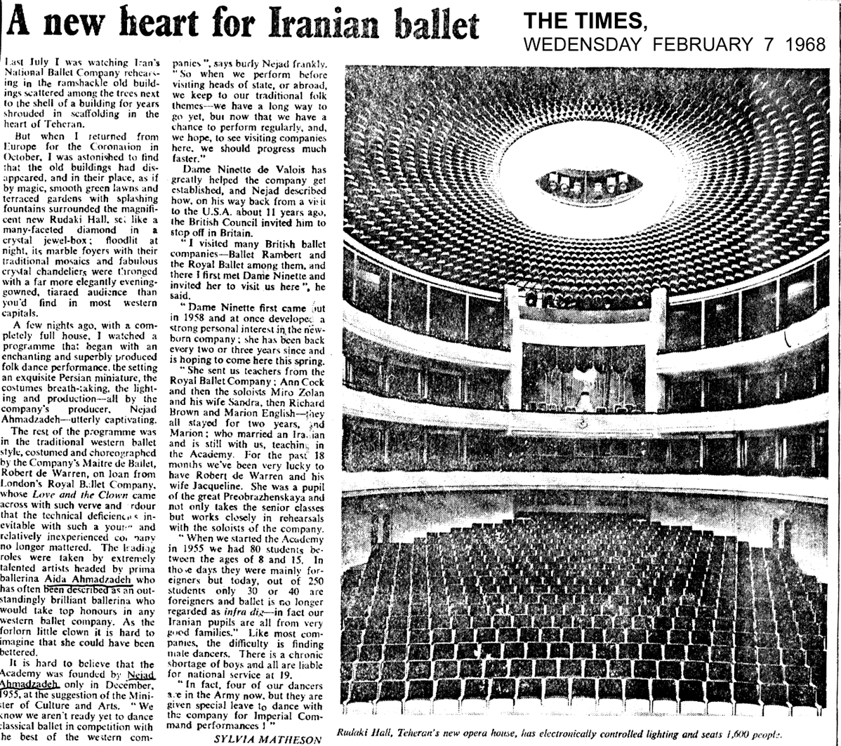 Dame Ninette de Valois who on the invitation of the Ministry of Culture and Arts went to Tehran in 1958 for establishing the institutionalized classical dance in Iran, sent many of her dancers, ballet masters and choreographers from the Royal Ballet to teach and stage ballet productions.
